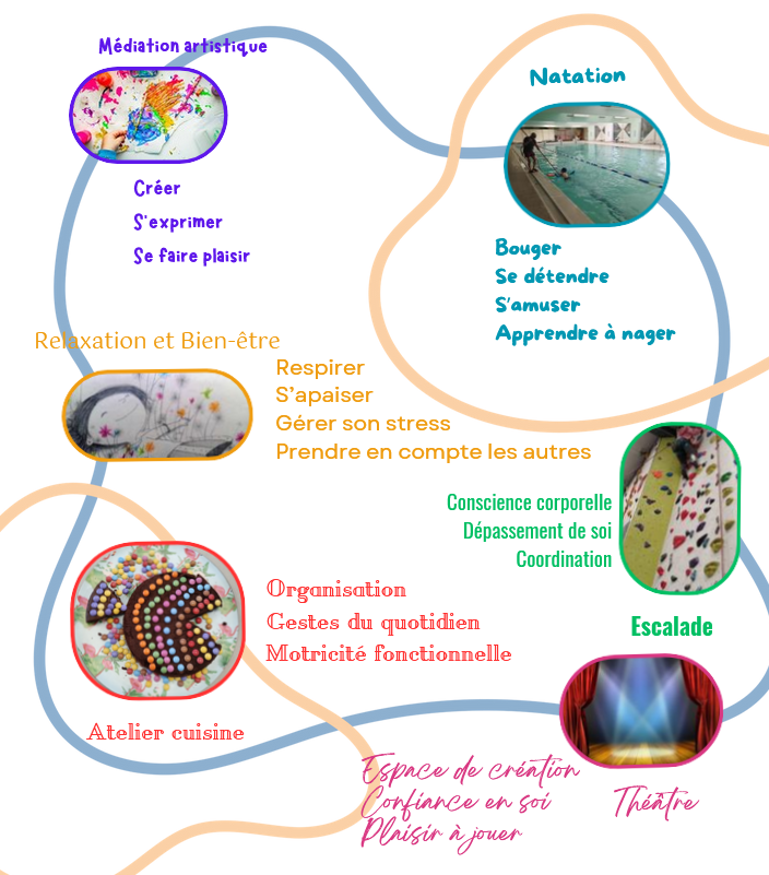 Au sein du SESSAD, plusieurs ateliers thérapeutiques sont développés selon les besoins des enfants évalués lors des projets personnalisés. Par exemple :
